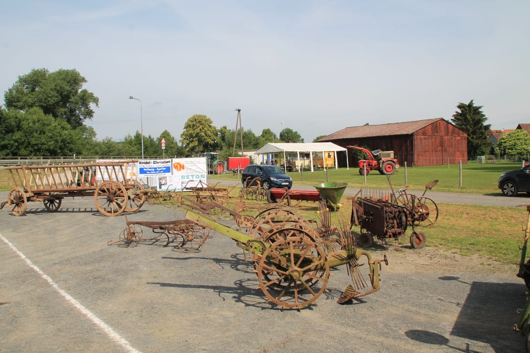 Vorn eine Drillmaschine DL 275 der Firma Amazone, die schon seit 1883 existiert. Rechts daneben eine Saxonia C aus dem Jahr 1935. Dazu u.a. Kalkstreuer,ein Amazone Düngerstreuer ZA-S, ein Nova Palatia Balkenmäher der Firma Lanz, eine Amazone Drillmaschine DL 275, ein Cramer Vielfachgerät, Ein seltener Bandrechschwader PZ ( Piet Zweegers). Quer zur Fahrtrichtung laufen Ketten, an denen Zinken senkrecht montiert sind. Und natürlich unsere verschiedenen Kartoffelroder. Dazu u.a. diverse Pflüge,ein Ackerwagen, ein früher von Pferden gezogener Kultivator sowie ein Häufler.