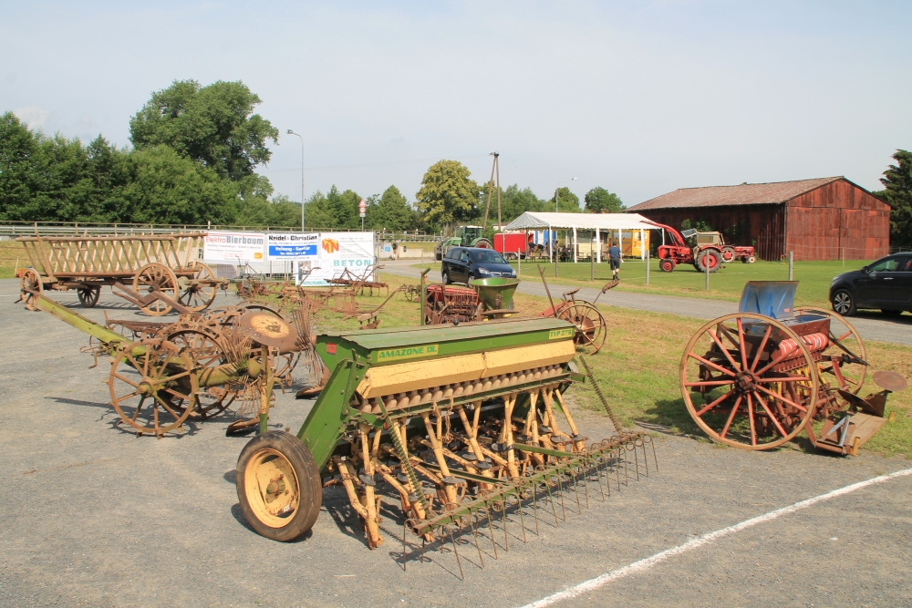 Vorn eine Drillmaschine DL 275 der Firma Amazone, die schon seit 1883 existiert. Rechts daneben eine Saxonia C aus dem Jahr 1935. Dazu u.a. Kalkstreuer,ein Amazone Düngerstreuer ZA-S, ein Nova Palatia Balkenmäher der Firma Lanz, eine Amazone Drillmaschine DL 275, ein Cramer Vielfachgerät, Ein seltener Bandrechschwader PZ ( Piet Zweegers). Quer zur Fahrtrichtung laufen Ketten, an denen Zinken senkrecht montiert sind. Und natürlich unsere verschiedenen Kartoffelroder. Dazu u.a. diverse Pflüge,ein Ackerwagen, ein früher von Pferden gezogener Kultivator sowie ein Häufler.
